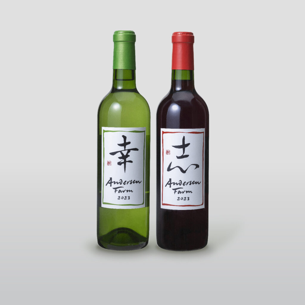 ベーカリー「アンデルセン」に農場があるのをご存じですか。北広島町から借り受けた土地を開墾し、2005年からぶどうとリンゴの栽培を始めました。栽培に適した土づくりに始まり、品種の選定、栽培方法の研鑽を積む日々。大切に育てたぶどうはワイナリー奥出雲葡萄園様で醸造していただき、赤ワイン「志」、白ワイン「幸」を販売しています。発売当初500本程度しか製造できませんでしたが、10年経った今、生産量を増やし、年間3000本ずつ製造できるようになりました。タンニンが少なくきめ細やかな舌触りの赤と、爽やかでフルーティな白、どちらも食事で楽しんでもらえるワインです。今後も食卓に幸せを届けられるよう、より良いものを育んでいきます。